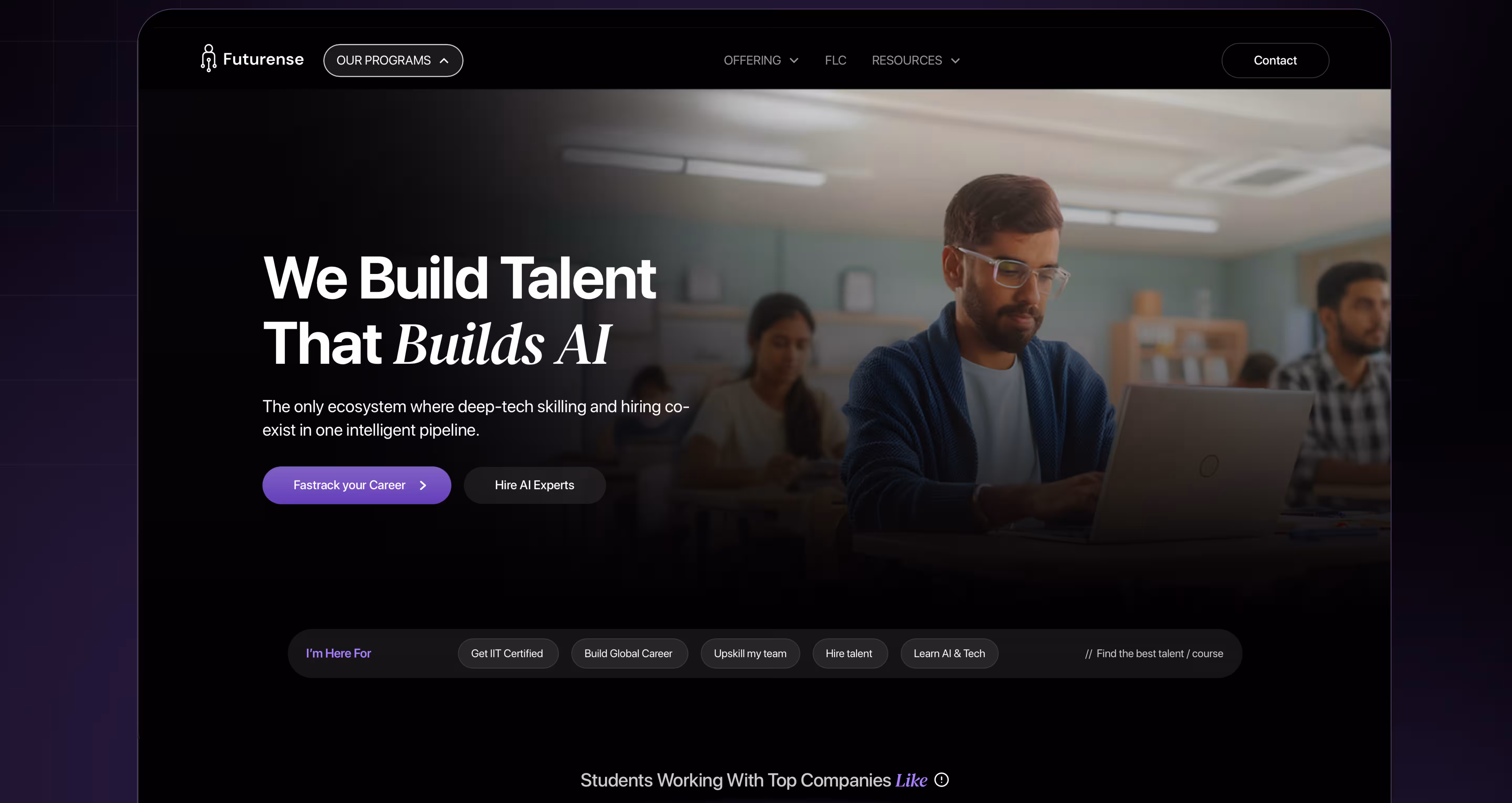 Futurense is an Indian education-technology company focused on AI skilling and helping learners build advanced tech careers. They partner with top institutions like IIT Jodhpur and global universities to offer hybrid degrees, global pathways (such as starting in India then moving to a US university), certifications, and placement-oriented programs.